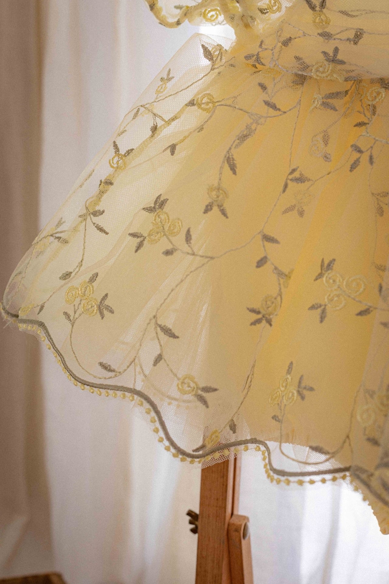 雙層薄紗結構搭配花卉刺繡,營造出豐富的質感和奢華的 氛圍,而裙擺底部的刺繡細節則成為視覺焦點,進一步提升了整體效果。